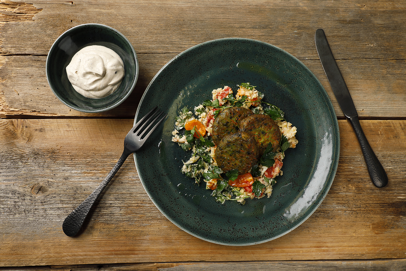Kuvassa lisukkeena valkosipulijugurttia, mutta voit halutessasi tarjoilla salaatin myös hummuksen tai korianterijugurtin kera.