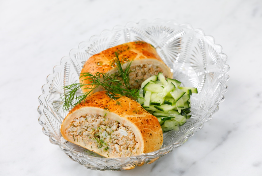 Reseptissä käytetty Lagerblad tuote6100 Kirjolohipiiras 100 gKypsä, pakaste.n. 50 kpl x 100 g = 5,0 kgKalatäyte [KIRJOLOHI 22 % (Oncorhynchus mykiss, viljelty, Suomi), riisi, laktoositon VOI (pastöroitu KERMA, suola), keitetty KANANMUNA, sipuli, vesi, jodioitu suola, tilli, persilja, muskottipähkinä, valkopippuri], kuori [VEHNÄJAUHO, laktoositon PIIMÄ, margariini [palmu- ja kookosrasva, rypsiöljy, vesi, suola, emulgointiaineet (E471, E472c), happamuudensäätöaineet (E330, E500), aromi], perunahiutale, leivinjauhe (nostatusaine (E450, E500, E341), VEHNÄTÄRKKELYS), jodioitu suola], KANANMUNAN KELTUAINEN, rapsiöljy, tilli. Kala voi sisältää ruotoja. Tuote saattaa sisältää soijan jäämiä.