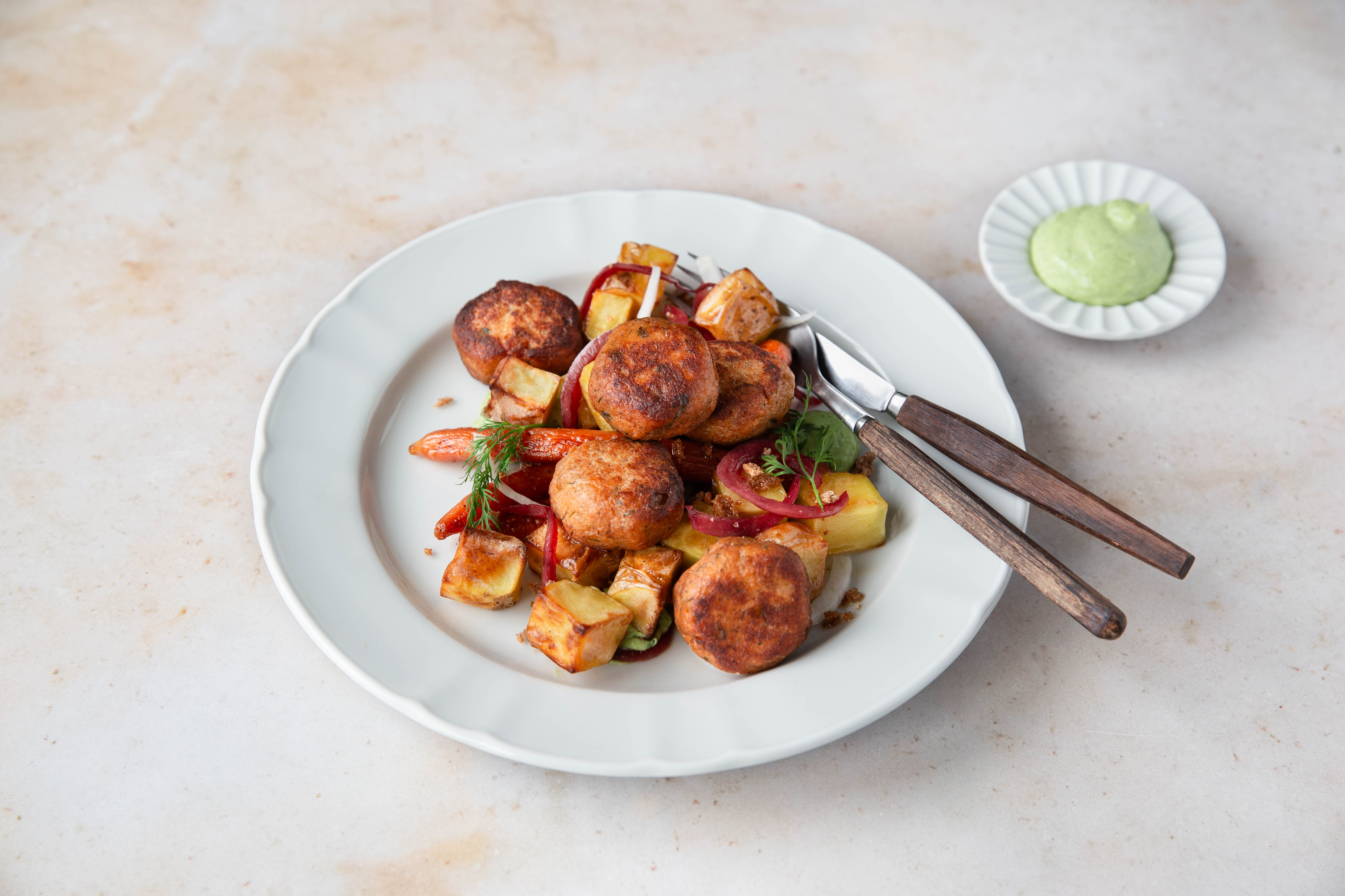 Muotoile juurekset haluamasi kokoisiksi paloiksi ja pyöräytä pienessä määrässä öljyä. Paahda leivinpaperin päällä 180°C uunissa kypsiksi ja kauniin ruskeiksi. Mausta suolalla pippurilla.