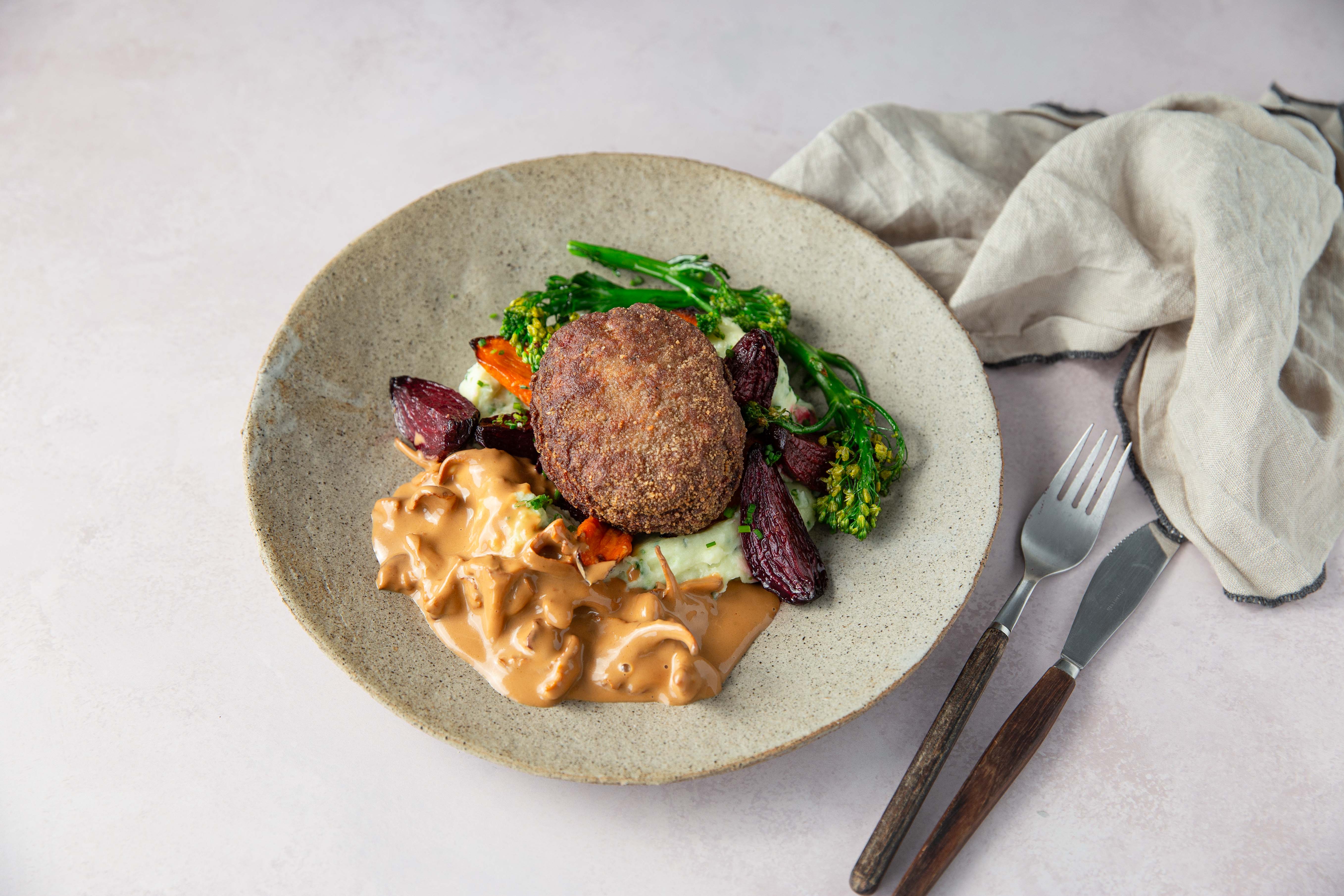 Tarjoile paistettujen kauden sienten, tumman riistakastikkeen ja karpaloiden kanssa.