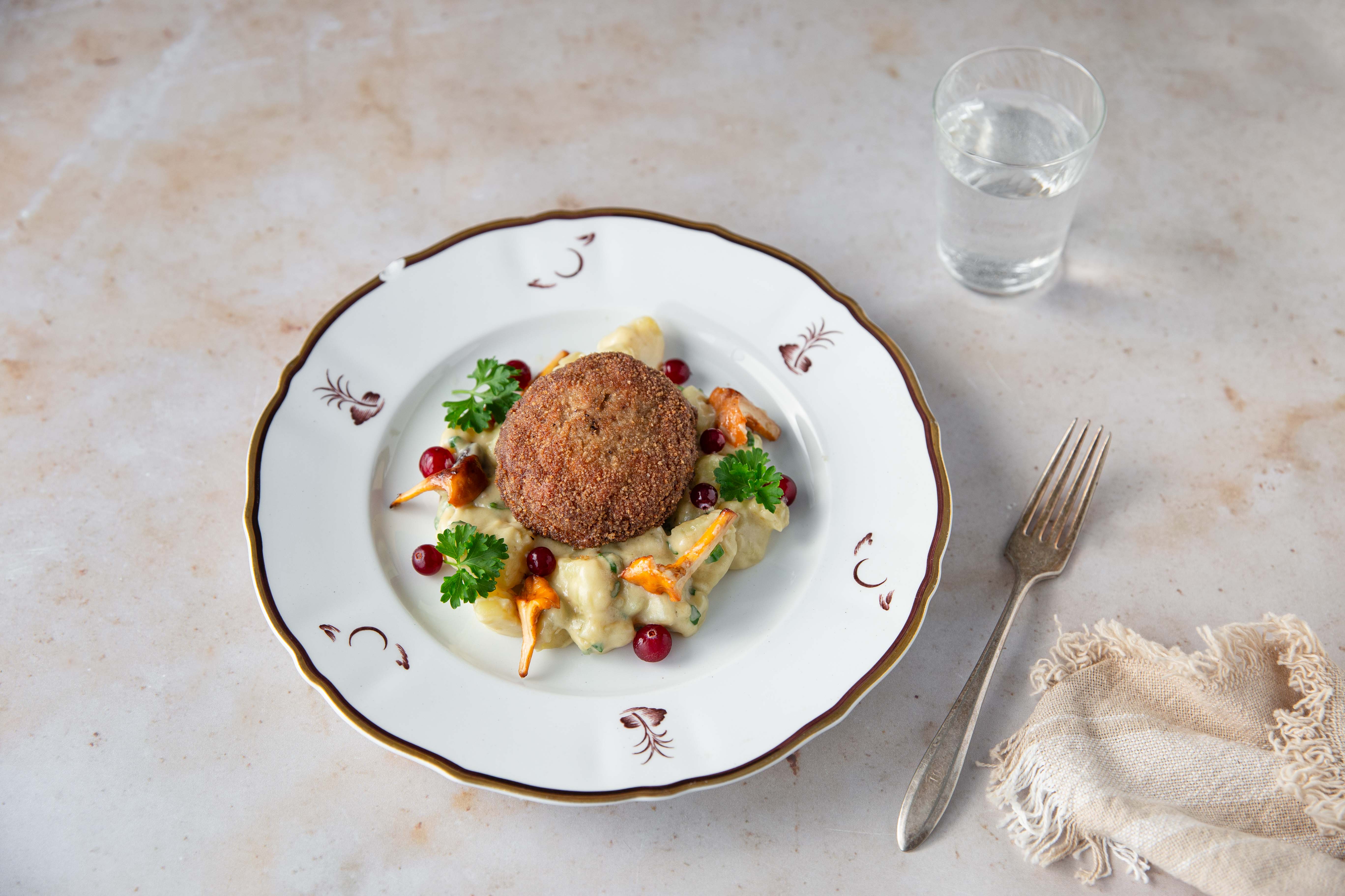 Tarjoile riistawallenberg uunissa paahdettujen punajuurten, voissa haudutetun brokkoliinin ja kantarellikastikkeen kanssa.