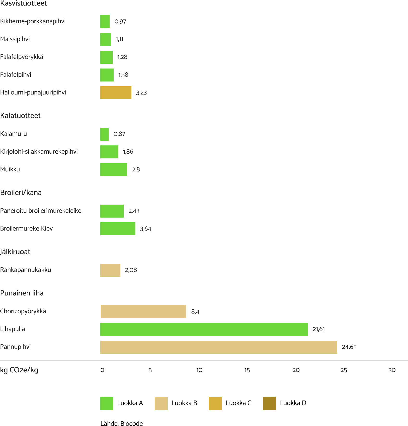 Me Lagerbladilla olemme sitoutuneet olemaan osa ratkaisua. Lagerblad Foodsin tuotteiden hiilijalanjälki on laskettu Biocode-tuotemerkillä. Värikoodaus indikoi tuotekategorian vertailua benchmark-lukua muihin markkinoilla oleviin tuotteisiin verrattuna. Vuoden 2024 aikana olemme laskeneet hiilijalanjäljet kaikille tukkutuotteillemme, jotta voimme tarjota sinulle mahdollisuuden tehdä ilmastoystävällisiä valintoja.